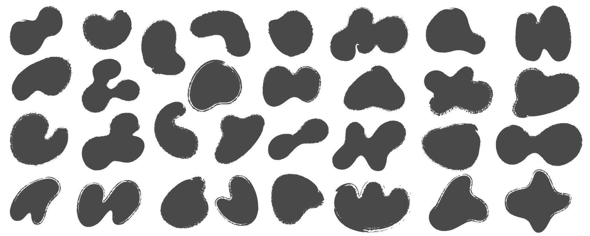 Brush abstract stains, paint shapes set with grunge texture. Round black ink splashes. Irregular organic blobs. Oval liquid rough graphic elements. Doodle blot blocks Pro Vector