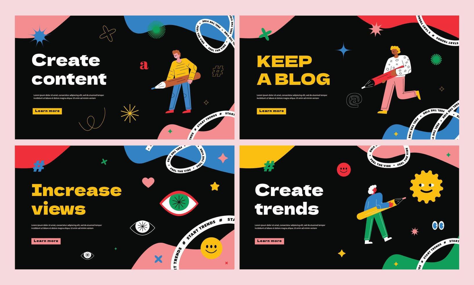 A set of templates for a website with cute scribble characters and bright wavy shapes Pro Vector