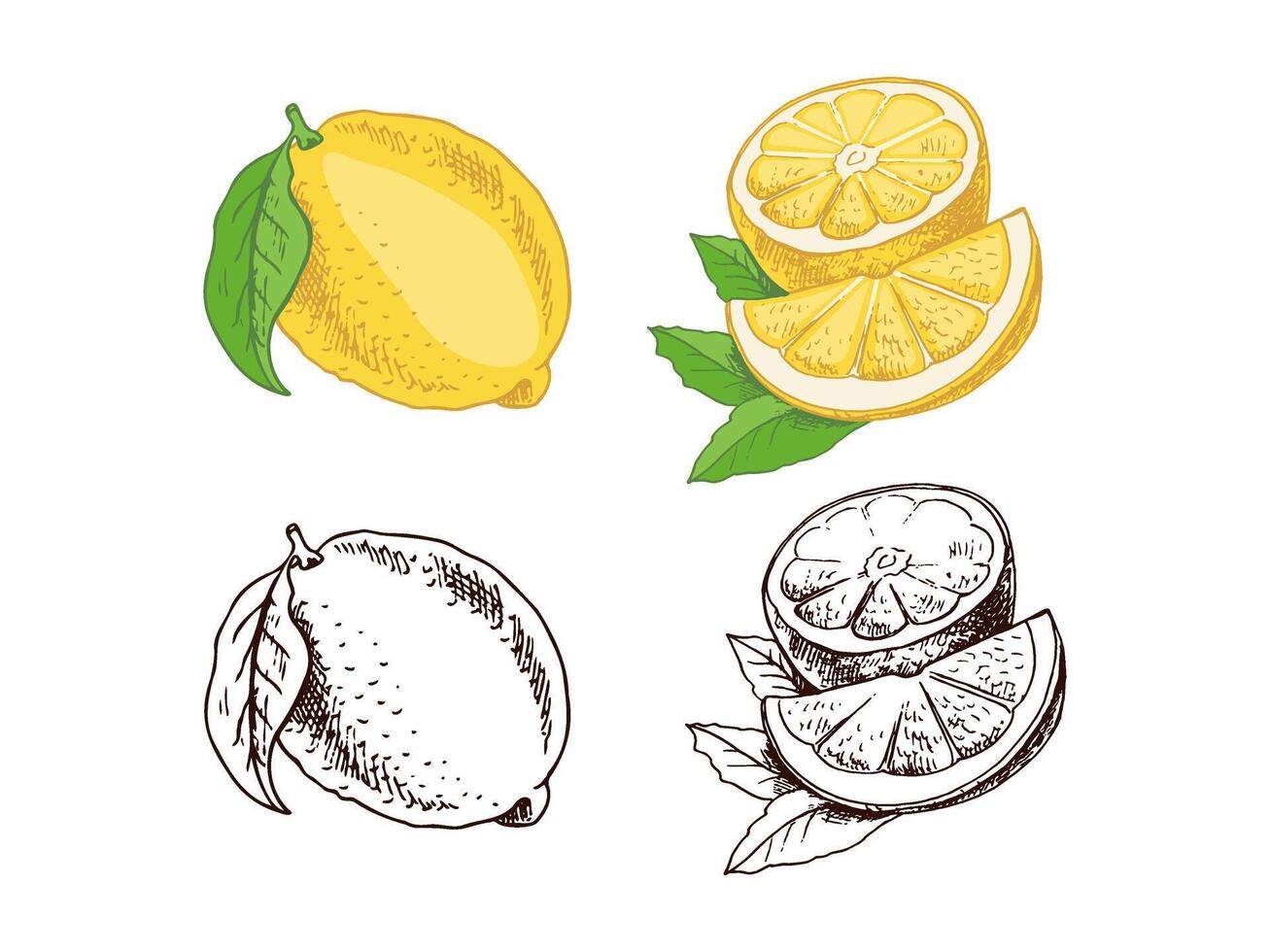 A hand-drawn sketch of a lemon. A plant with leaves. A slice of lemon and half a lemon. Citrus. Orange, grapefruit. Great for a poster, menu or label. Pro Vector