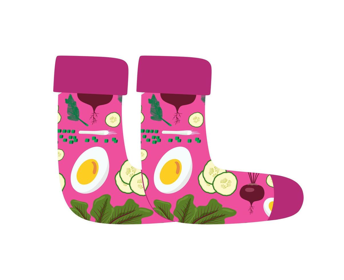 Socks with Lithuanian cold beet soup pattern. Pink soup ingredients. Egg, beetroot, cucumber, onion and dill. Isolated on white background. Pro Vector