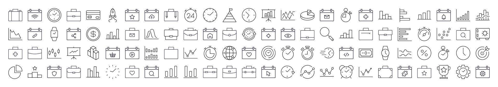 Collection of Business Related Line Icons. Editable Stroke for Design, Web Sites, Apps, Cards. Contains Linear Images of Briefcase, Clock, Startup, Analyzing, Management Pro Vector