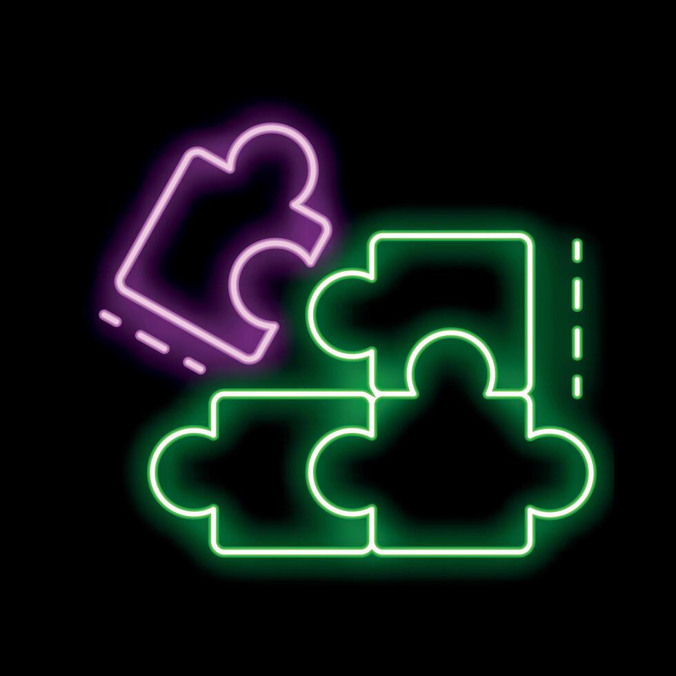 Neon puzzle pieces connecting, problem solving and solution finding concept Pro Vector