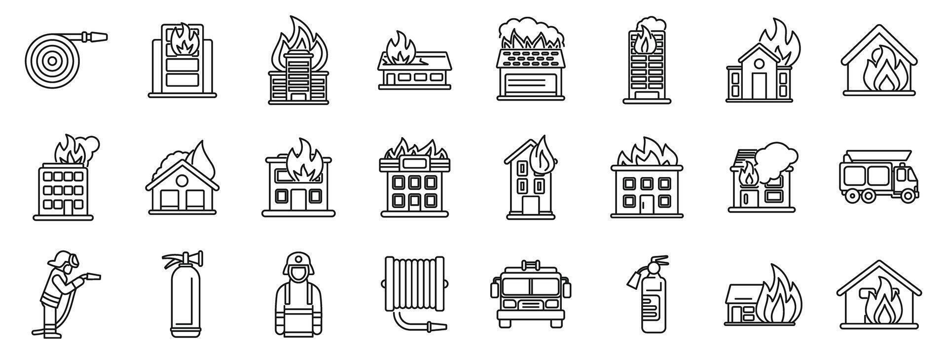 Burning building icons set. Firefighter extinguishing fire with extinguisher protecting building from burning down line icon set Pro Vector