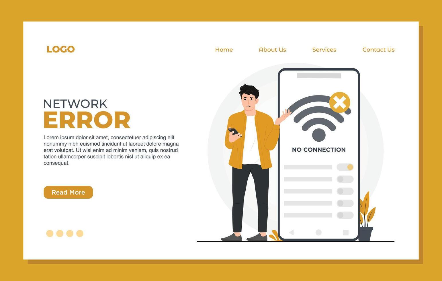 Network Error 404 concept for landing page template web site design template with flat illustration of man with smartphone and internet connection icon. Pro Vector