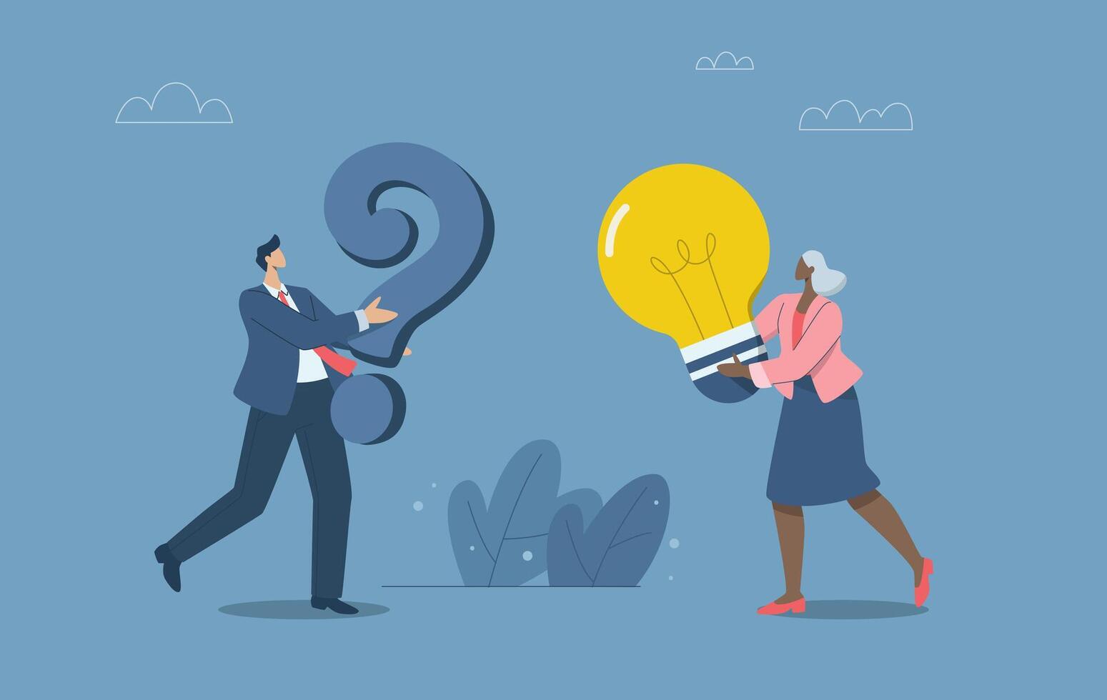 Question or problem with answers or ideas, Creating questions and answering or solving problems, Business solutions, Businessman holding question mark and businesswoman holding light bulb. Pro Vector