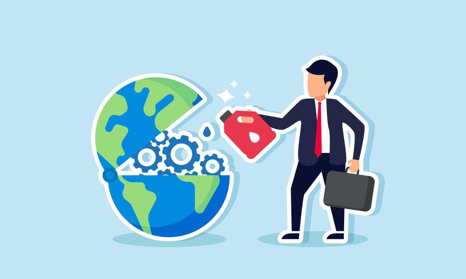 A businessman lubricates the gears of a globe, an illustration of the importance of caring for the environment instead of solely exploiting it. Pro Vector