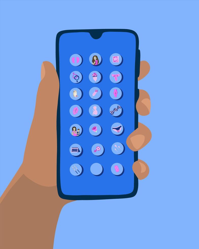 A person holds a mobile device featuring various icons for a fertility app while exploring its features in a relaxed environment Pro Vector