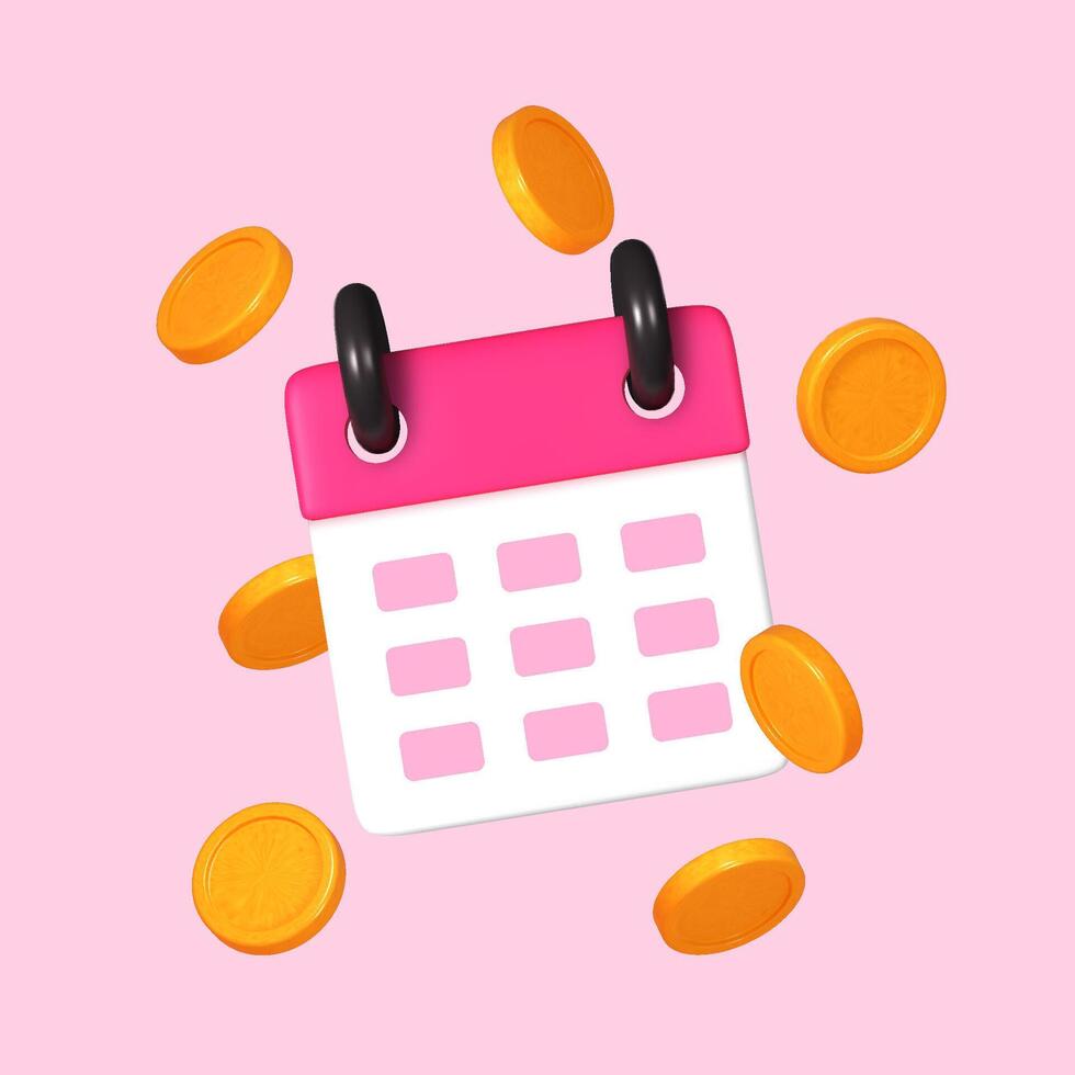 3D calendar icon with a coin. Minimalist concept symbolizing a confirmed appointment, success, approval, or task completion. 3D rendering. Pro Vector