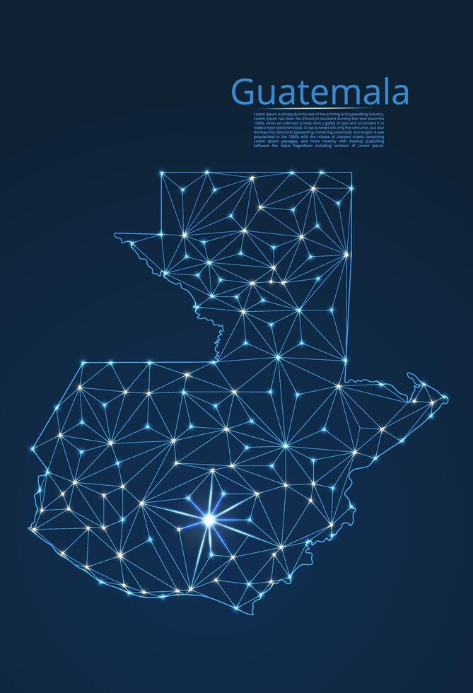 Guatemala communication network map. low poly image of a global map with lights in the form of cities in or population density consisting of points and shapes in the form of stars and space. Pro Vector