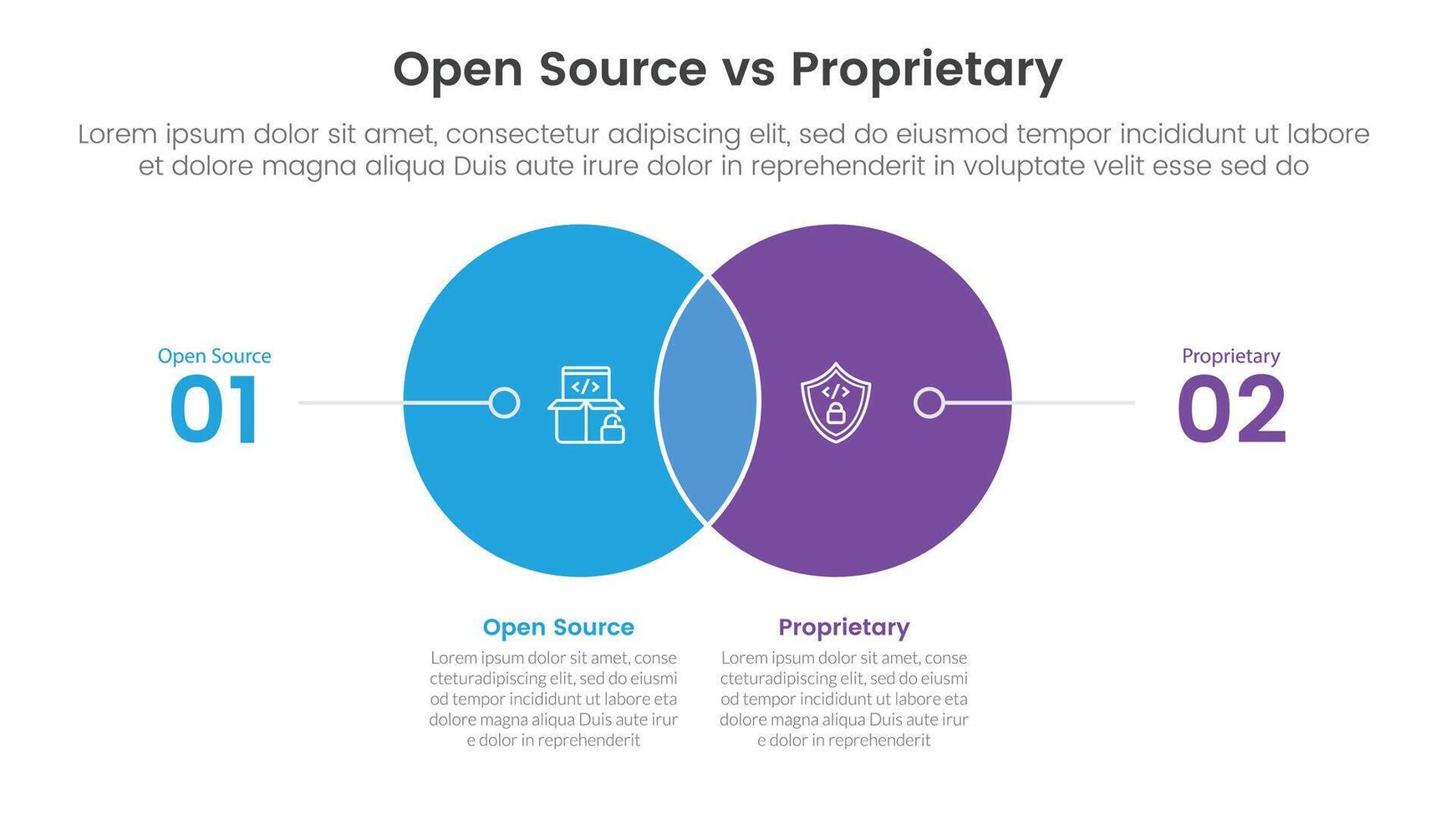 open source vs proprietary software comparison concept for infographic template banner with small circle venn blending and line pointer with two point list information vector