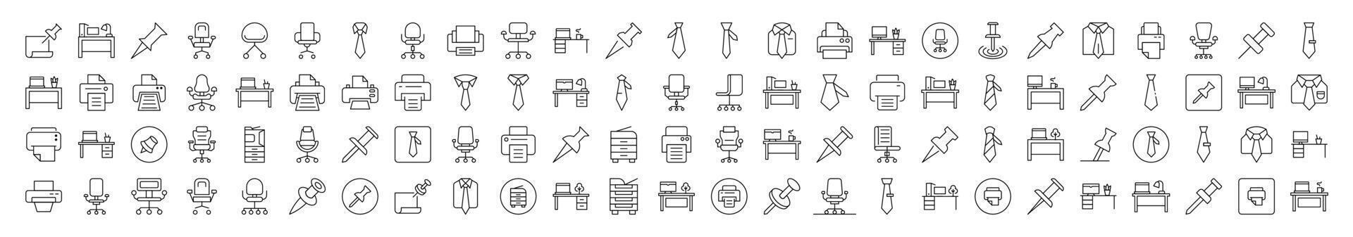 Collection of Office Related Line Icons. Editable Stroke for Design, Web Sites, Apps, Cards. Contains Linear Images of Push Button, Tie, Workspace Pro Vector