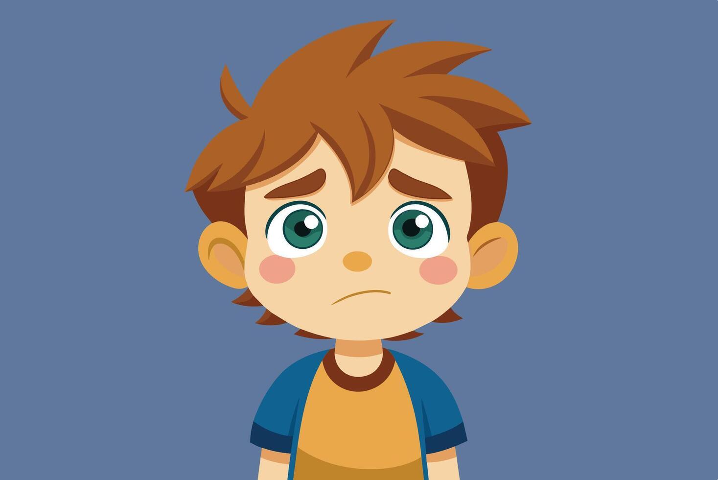 A young boy with a worried expression looks directly at the viewer against a simple blue background, showcasing emotion and vulnerability vector