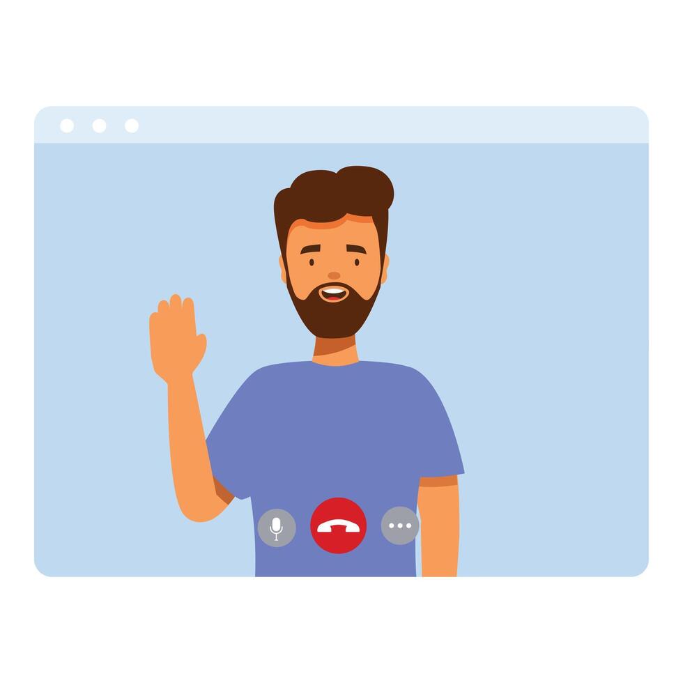 Man waving on video call interface with microphone and end call buttons Pro Vector
