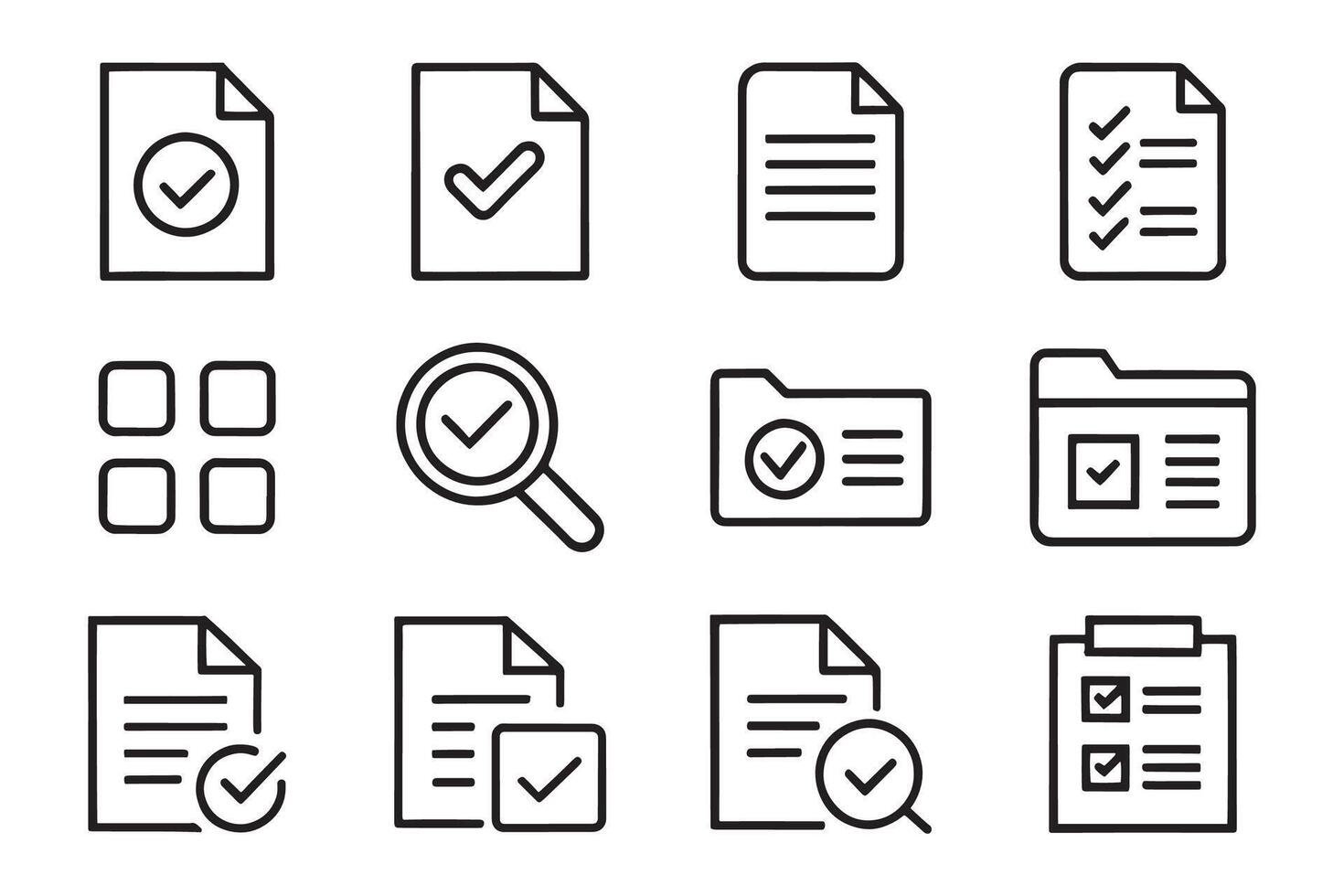 Files, checkmark, find, search, paper related editable icon set isolated flat illustration white background Free Vector