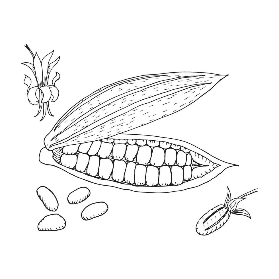 Cocoa beans illustration. Sketched hand drawn cocoa beans painted by black inks on isolated background in linear style. vector