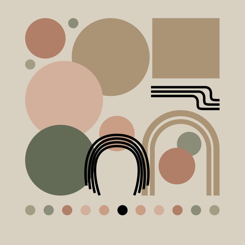 Minimalist geometric composition with earthy tones of beige, tan, and muted green. Features overlapping circles, squares, and abstract lines arranged in a balanced and modern aesthetic. Free Free Vector