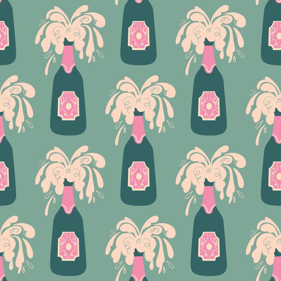 Seamless pattern with champagne in retro style. Sparkling champagne bottle exploding. Pro Vector