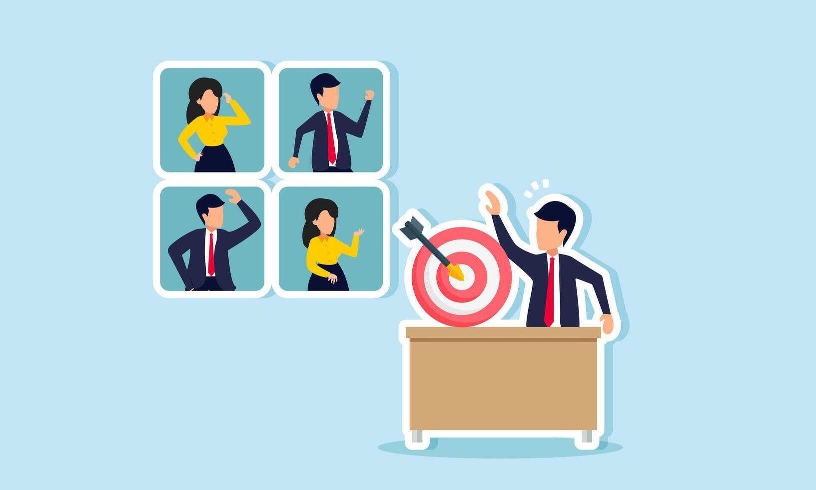 A businessman with a target board is having an online meeting with partners, illustrating a discussion on evaluating and monitoring the company's business target progress. Pro Vector