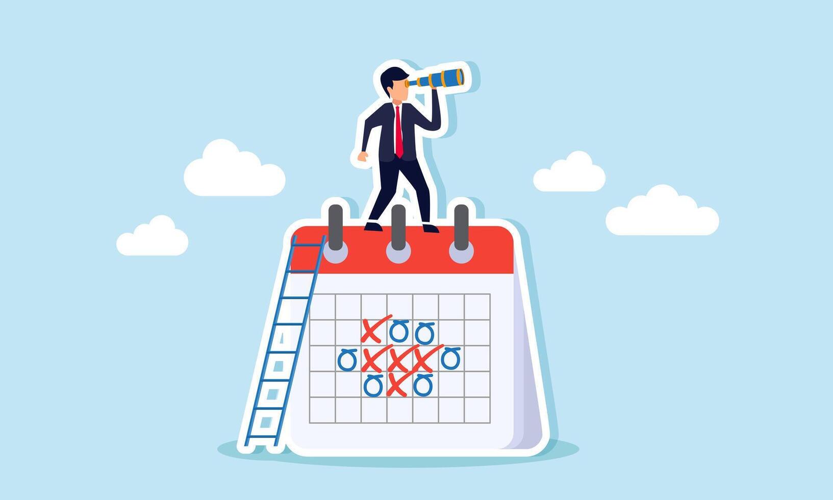 A businessman is climbing an agenda calendar with a ladder while using a telescope, illustration of a vision for creating an effective and efficient business schedule. Pro Vector