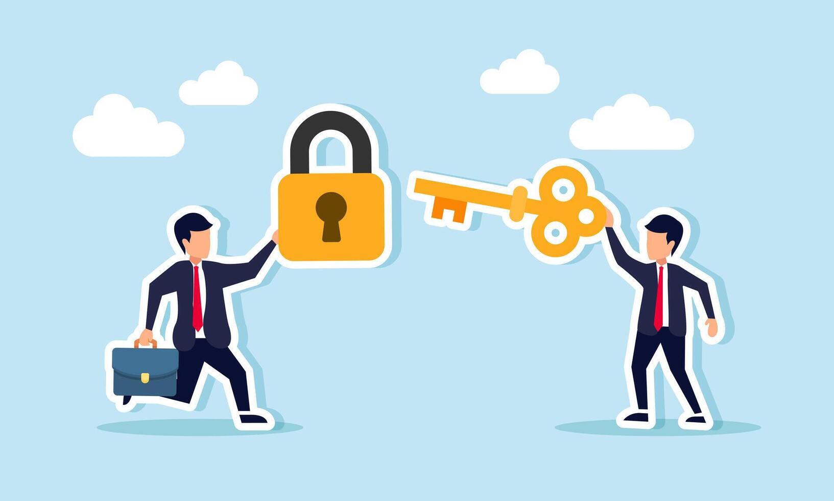 A businessman carries a lock while another carries a key to combine, illustration of business collaboration in finding joint solutions to business problems or a win-win solution Pro Vector