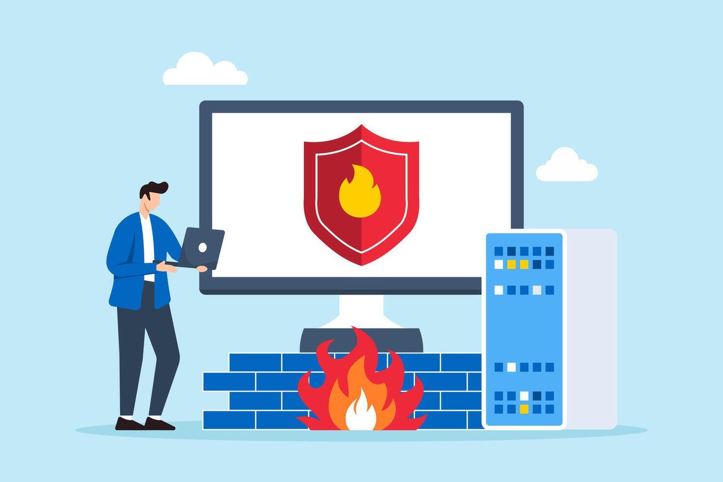 Flat illustration of engineer setting up firewall on server with security shield Pro Vector