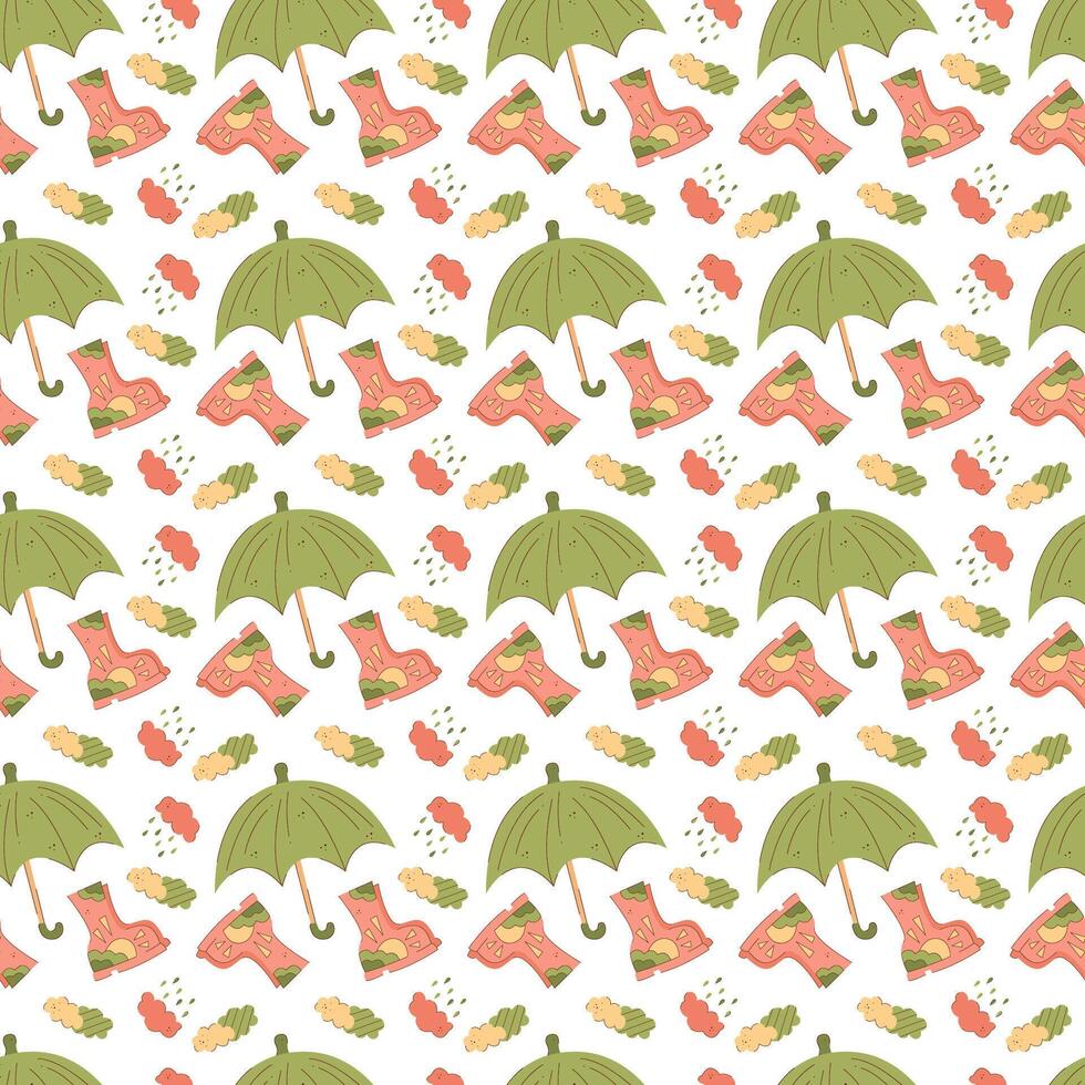 Seamless pattern with an umbrella, rubber boots and clouds. Suitable for wrapping paper. Pro Vector