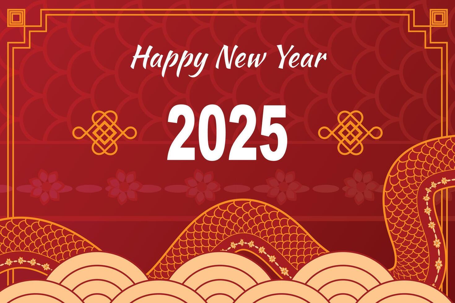 Chinese style Happy New Year 2025 banner, with a snake and traditional wave patterns on a red background Pro Vector