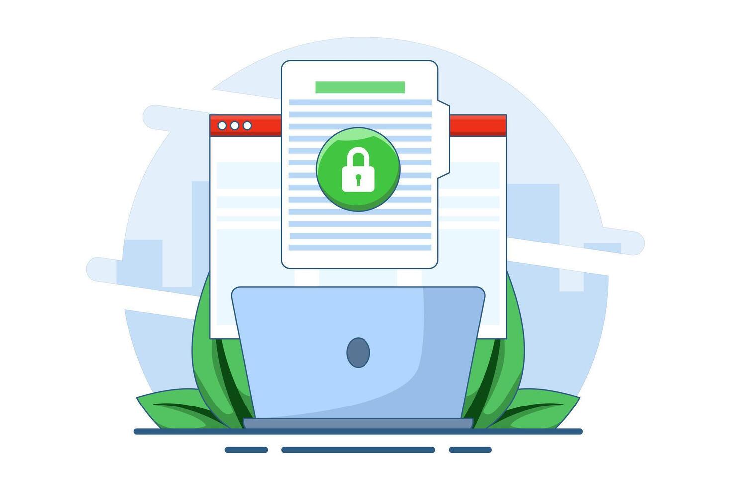 concept of secure confidential online document access on laptop computer or internet web privacy protection on text file flat icon, private secret website data lock modern symbol. illustration. Pro Vector