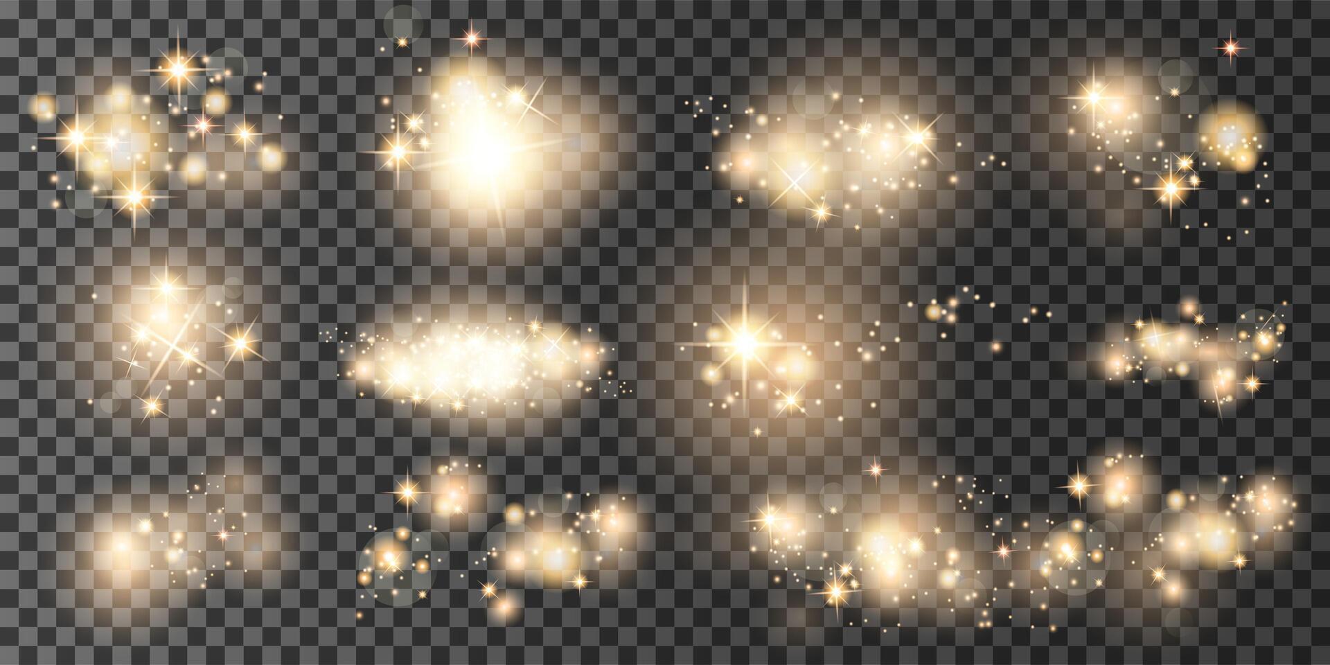 Shiny glowing star dust set of elements for overlay design. Christmas glowing dust background. Bokeh light lights effect background. Glitter textures overlay for design collection. Shine Light Pro Vector