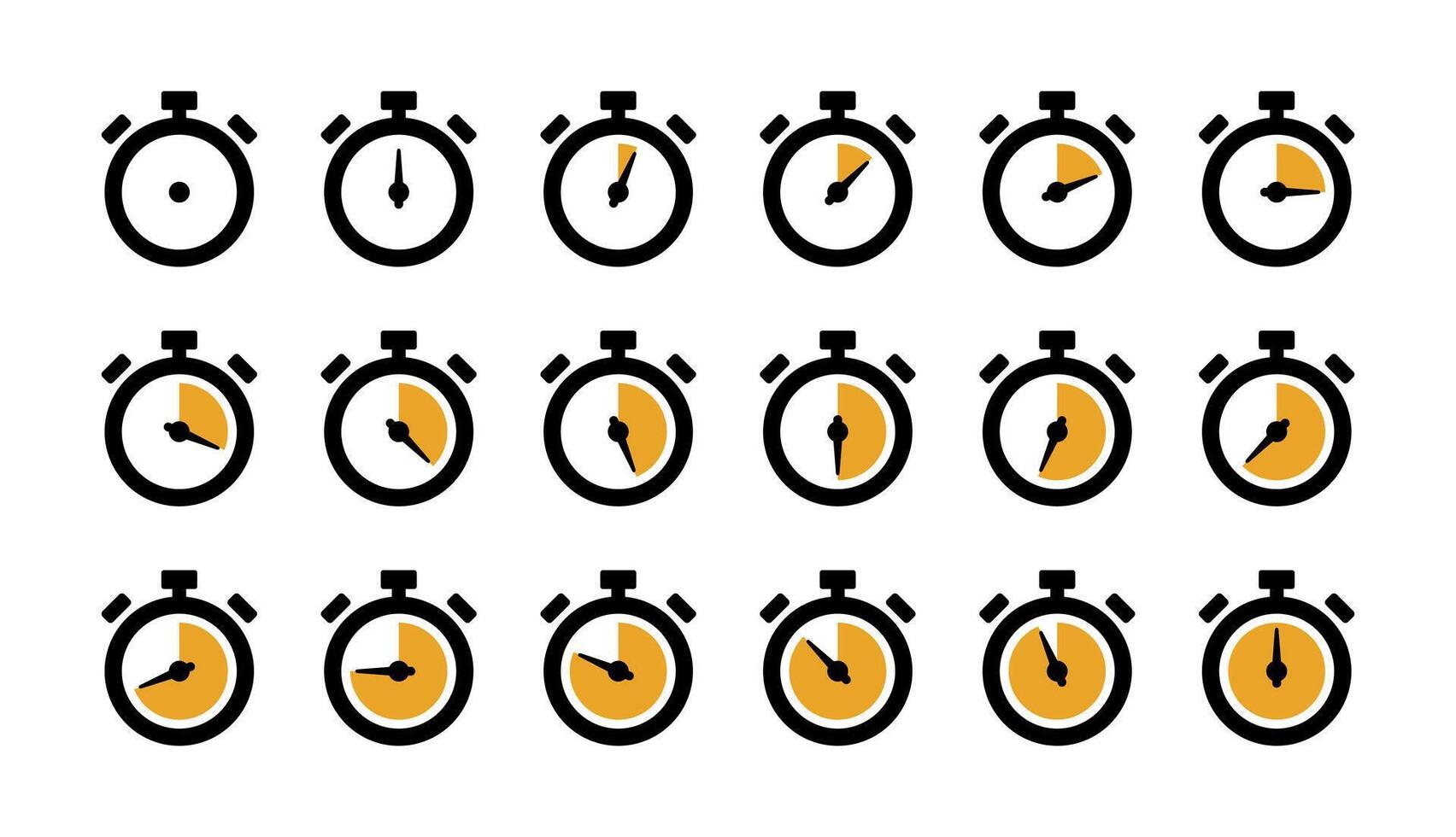 Timer icon set. Stopwatch countdown indicator template collection. Time watch illustration. Alarm clock symbol. Cooking timer sign. Express delivery pictogram. Sport chronometer. Speed measure. Pro Vector
