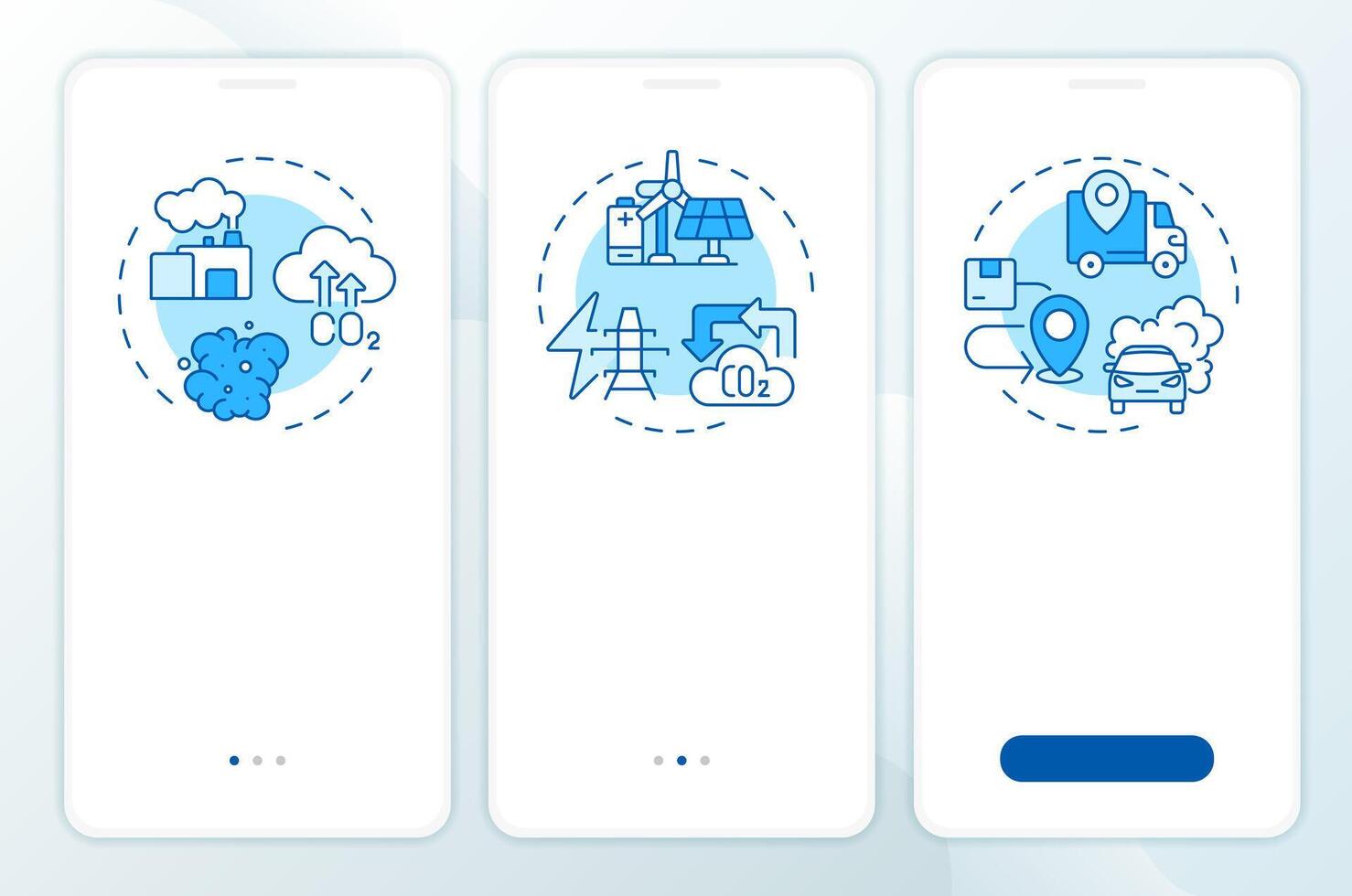 CO2 emissions blue onboarding mobile app screen. Walkthrough 3 steps editable graphic instructions with linear concepts. UI, UX, GUI template Pro Vector