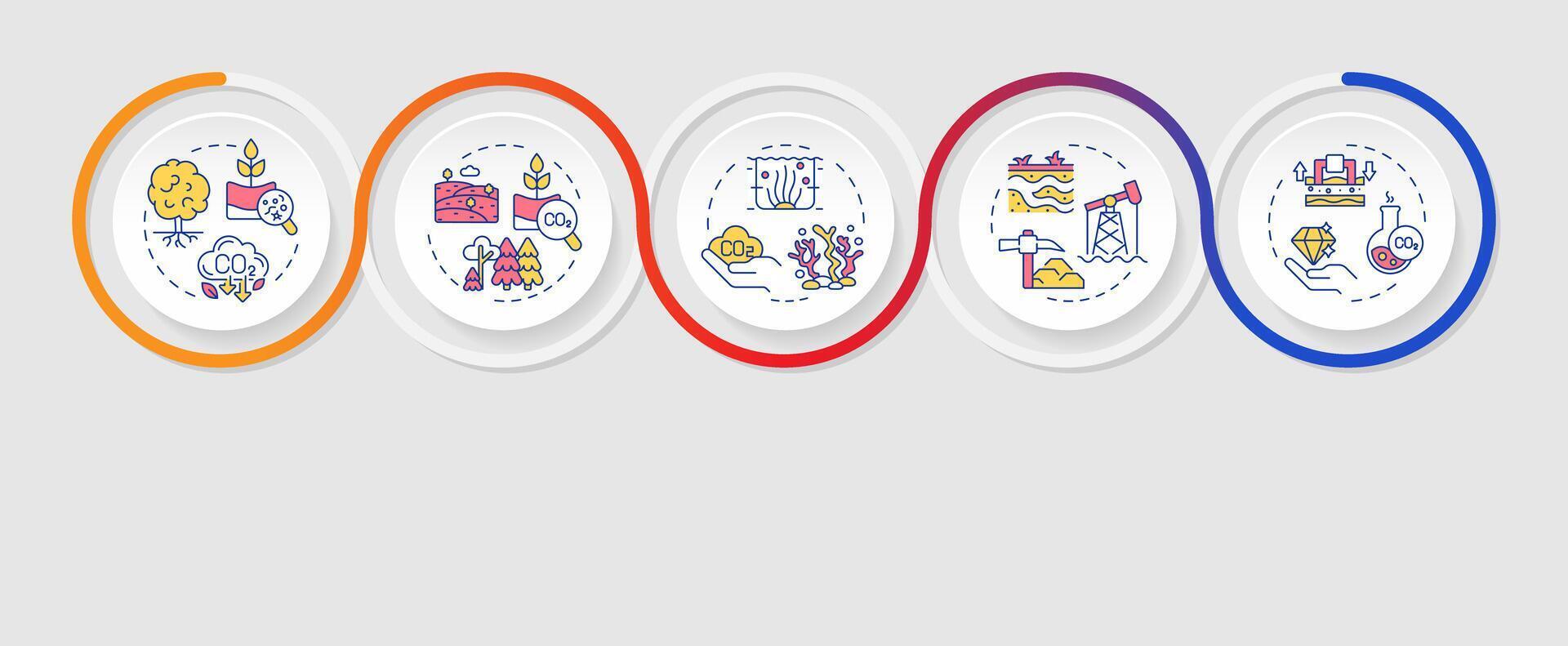 Carbon sequestration methods infographics circles sequence. Environment preservation. Visualization layout with 5 steps. Info chart loop process presentation Pro Vector