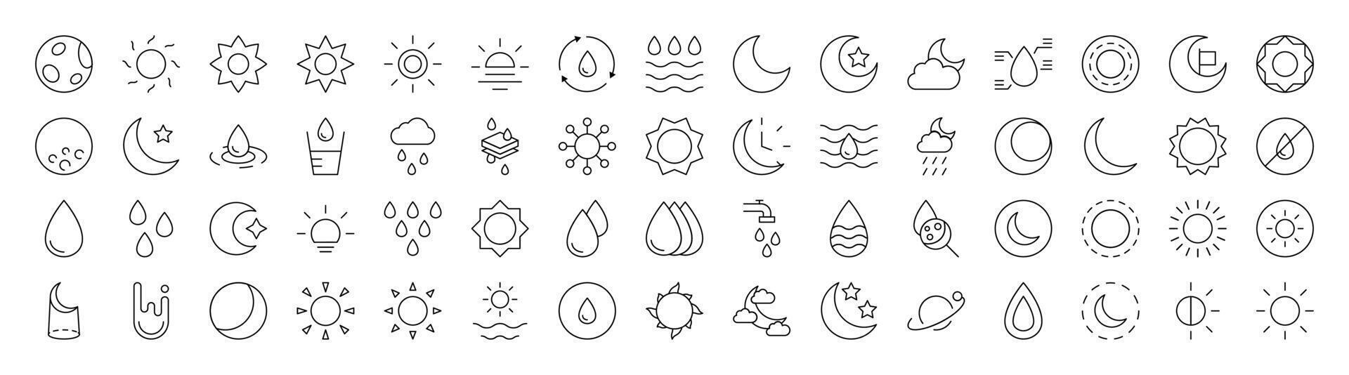 Set of Weather Related Line Icons. Editable Stroke for Design, Web Sites, Apps, Cards. Contains Linear Images of Sun, The Moon, Shower Pro Vector