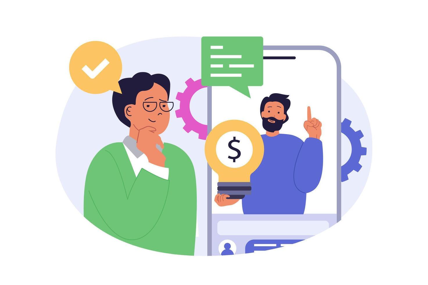 Social media concept in modern flat design for web. Man watching live broadcasting using mobile app, getting new financial information online from blog, leaving like and comments. illustration. Pro Vector