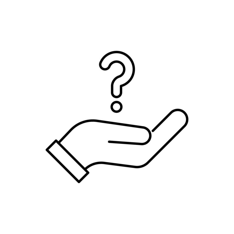 Hand holding question mark icon. Outline style. Why, who, doubt, uncertainty, curious, ask, curiosity, interrogation concept. illustration isolated on white background Pro Vector
