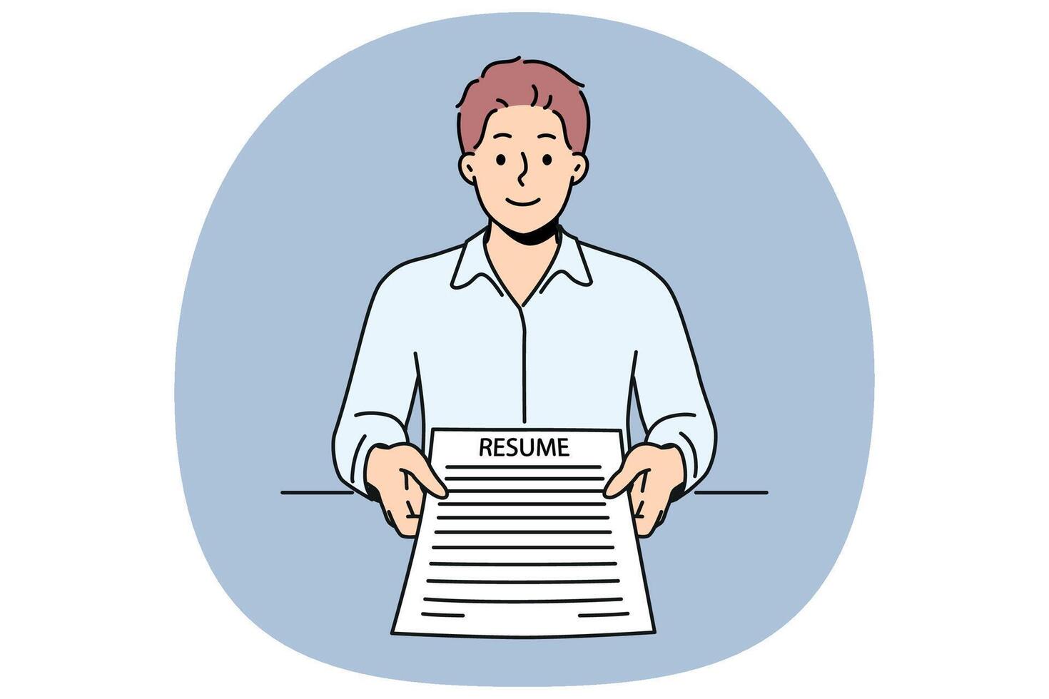 Man applicant with resume in hands came to interview in company to get desired job with high salary Pro Vector