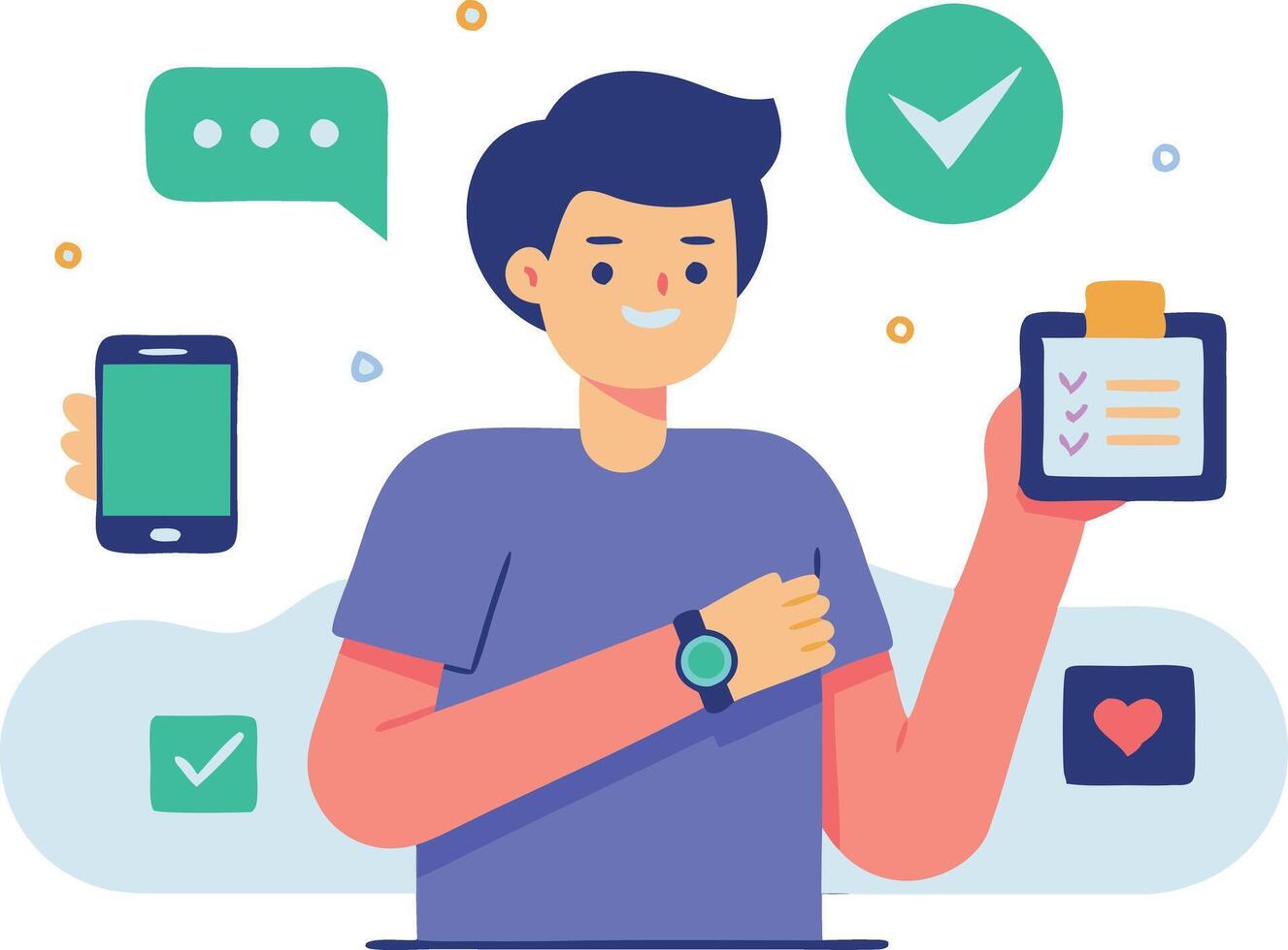 A modern illustration of a person using multiple apps on a smartphone, symbolizing technology, multitasking, and connectivity. Pro Vector