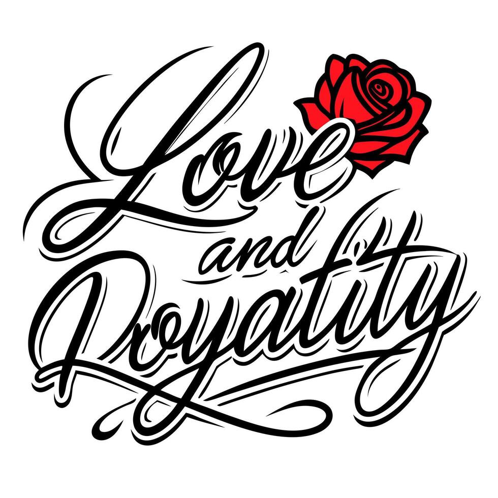 a illustration of the text love and loyalty in cursive script behind the text is a red rose Pro Vector