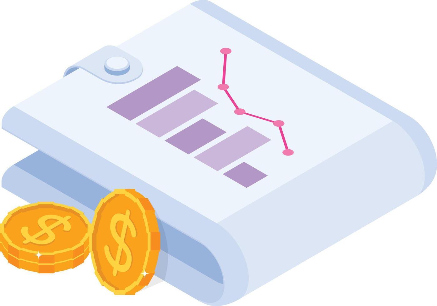 Isometric Wallet with Bar Graph and Coins Pro Vector