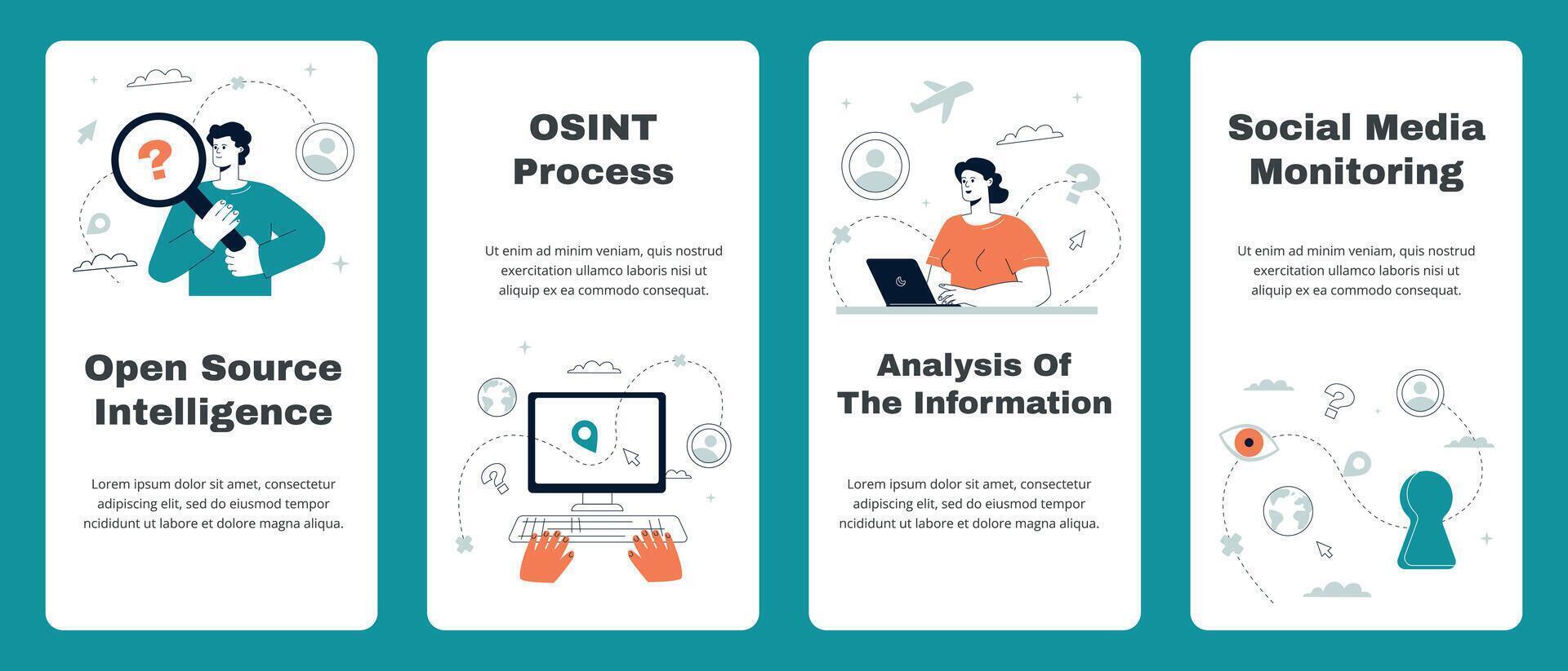 A collection of storis layout designs with illustrations on the OSINT theme. A man with a giant magnifying glass, a woman is looking for information on the Internet. Pro Vector