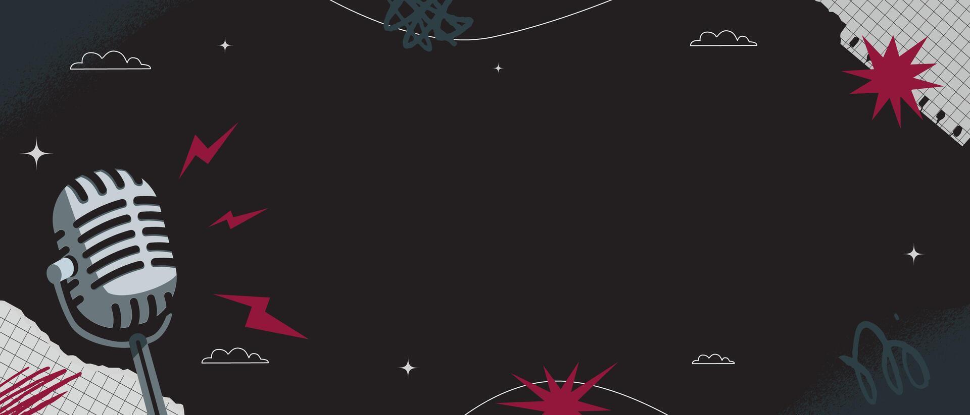 Textured background in the style of a minimalist collage with a retro microphone, torn pieces of paper, strokes on a black background. Pro Vector
