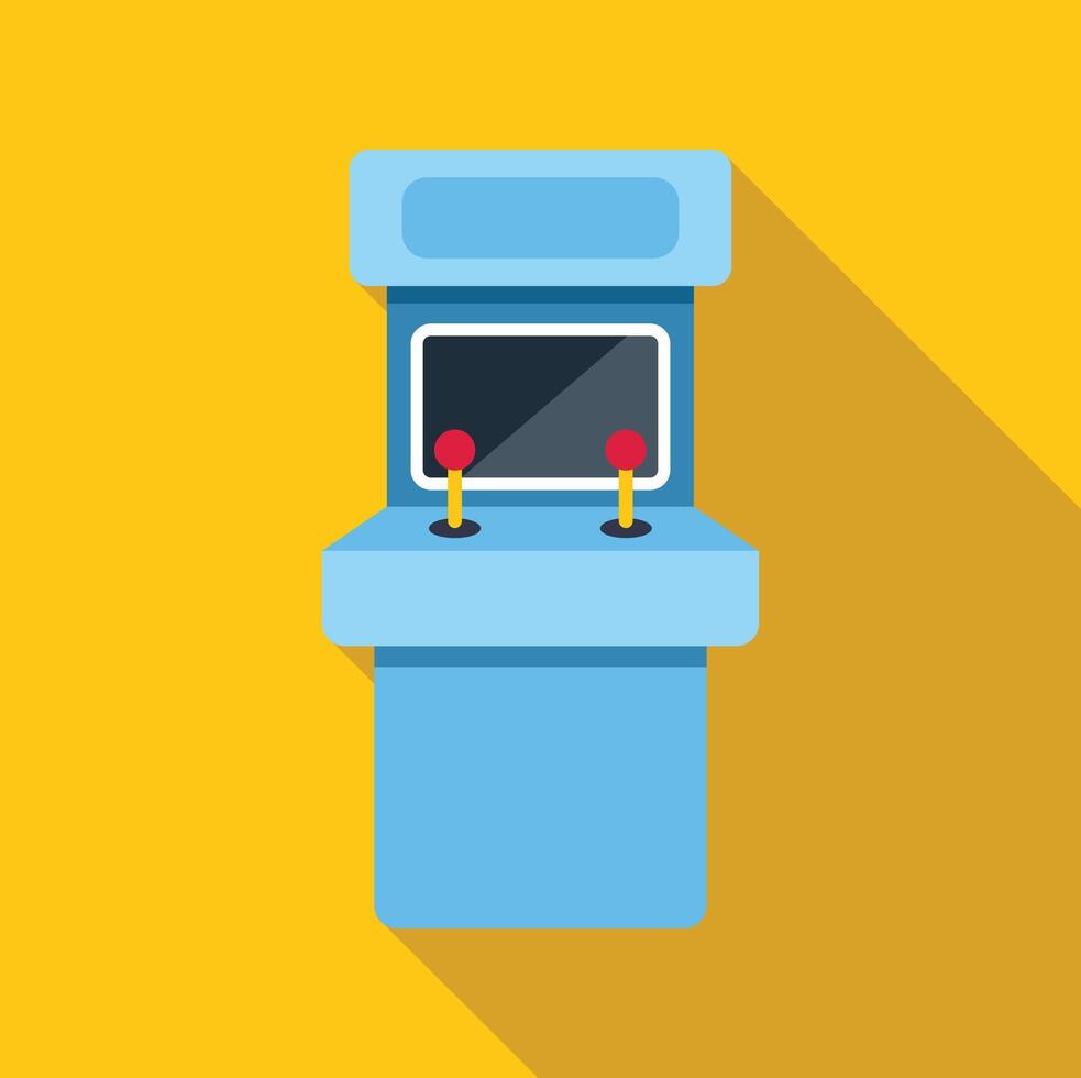 Blue retro arcade game console with two joysticks is standing on yellow background Pro Vector