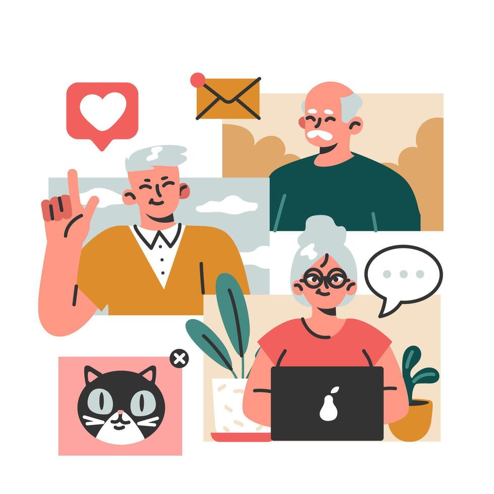 Modern old characters using internet and computer. Seniors confidently Pro Vector