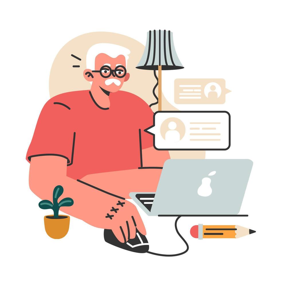 Modern old male character using internet, mobile phone and computer Pro Vector