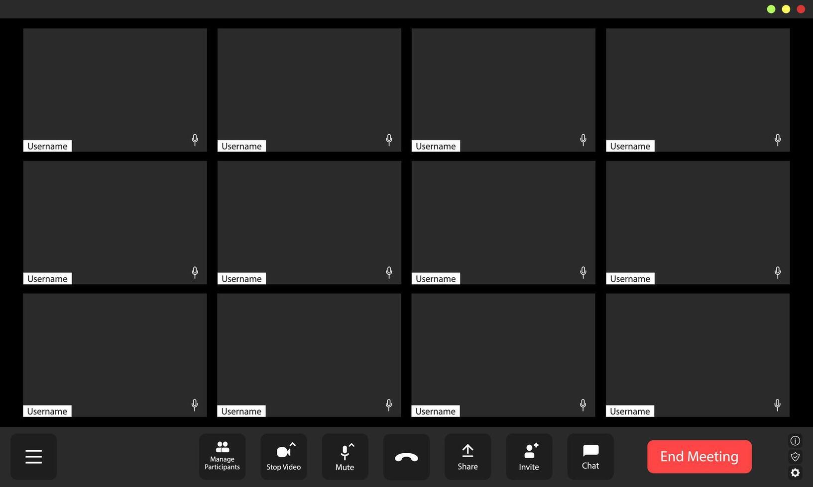 Virtual meeting room with empty participant slots and tools for communication and collaboration Pro Vector