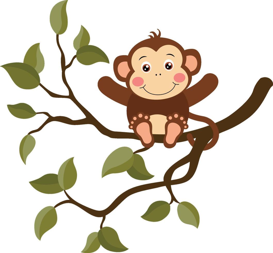 Happy monkey sitting on a tree branch with leaves Pro Vector