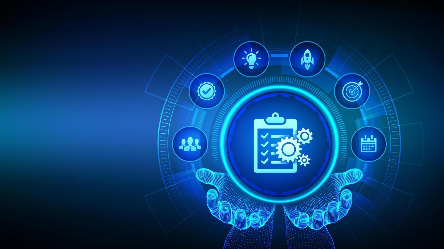Project management icon in wireframe hands. Effective time planning technology concept. Project development. Business target. Company strategy. illustration. Pro Vector