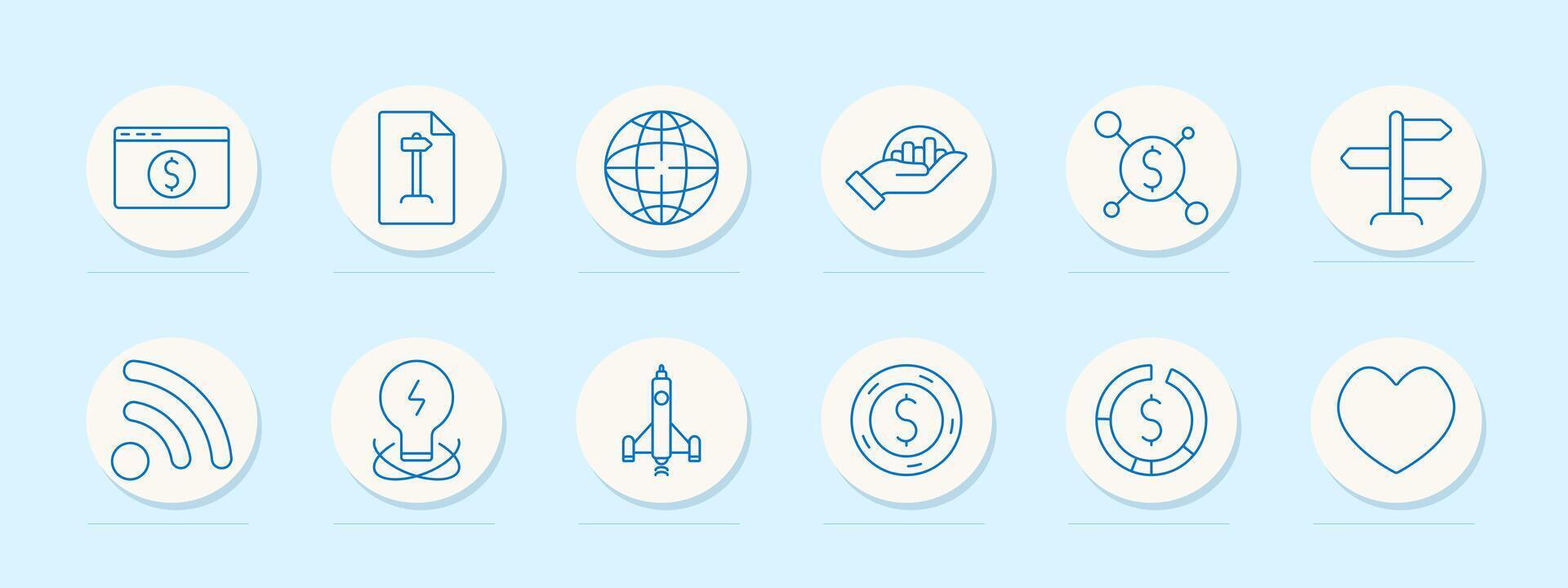Finance icons set. Web page with dollar symbol, bar graph on clipboard, globe, hand holding bar chart, coin network, direction signs, Wi-Fi signal, light bulb, rocket, coin stack, pie chart, heart Pro Vector