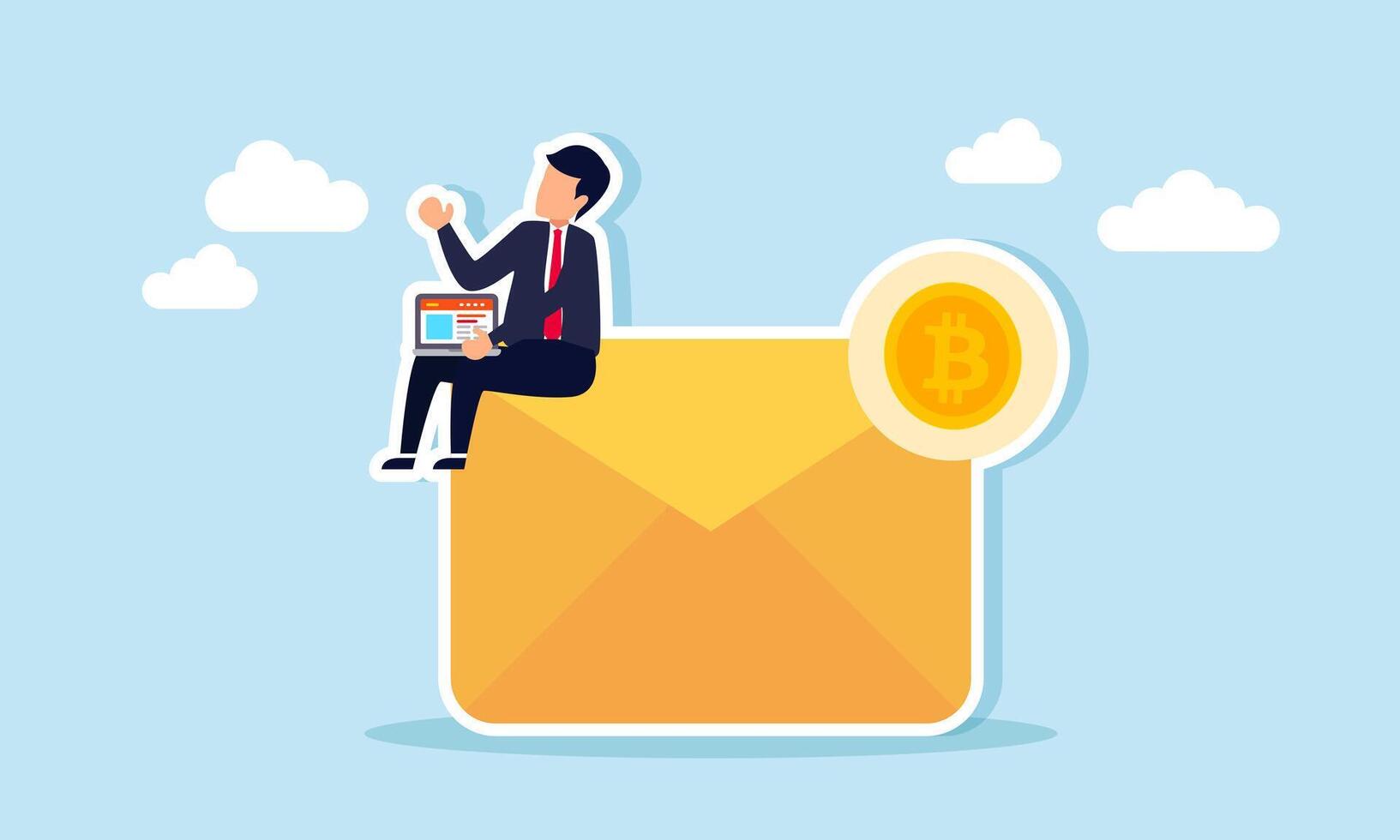 A businessman sits on an envelope with a bitcoin notification while using a laptop, illustrating the report and analysis of bitcoin performance Pro Vector