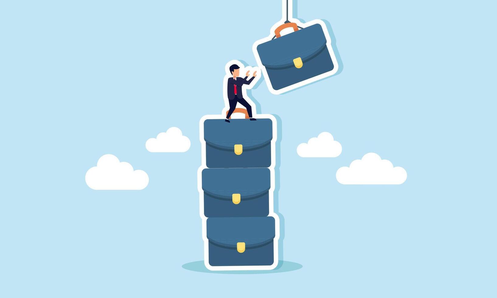 A businessman climbing a stack of briefcases and trying to catch another briefcase hanging from a string, illustration of the effort to secure a new business project Pro Vector